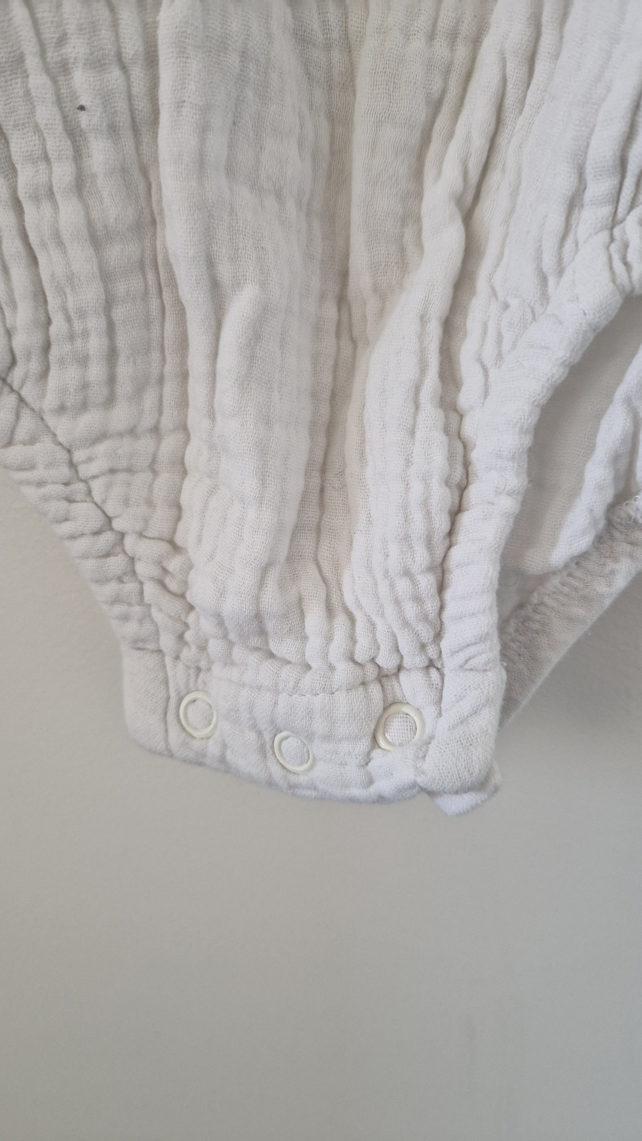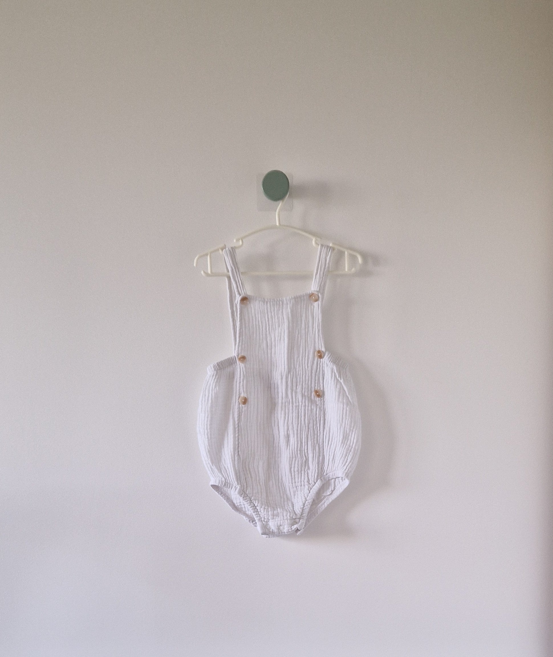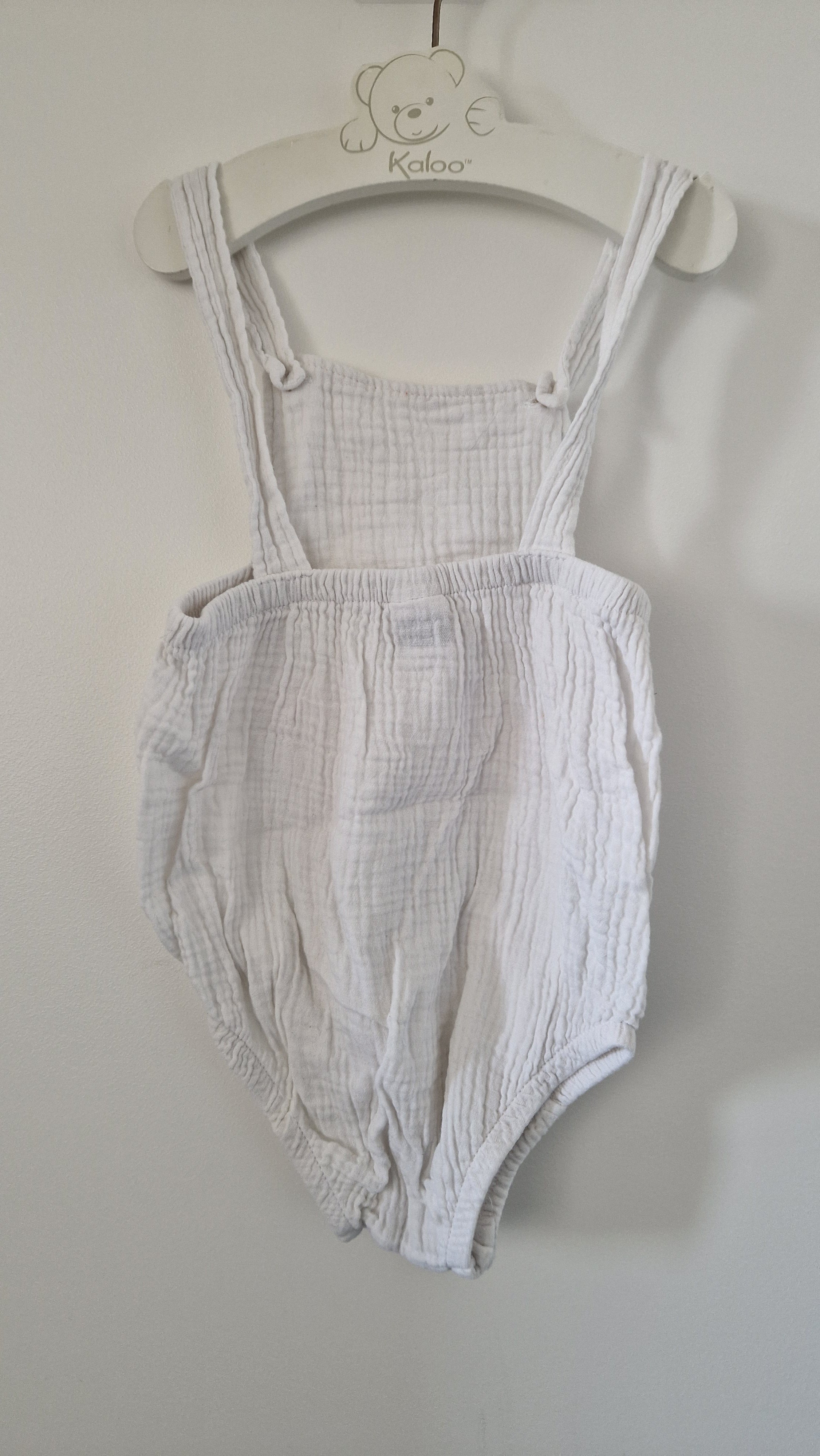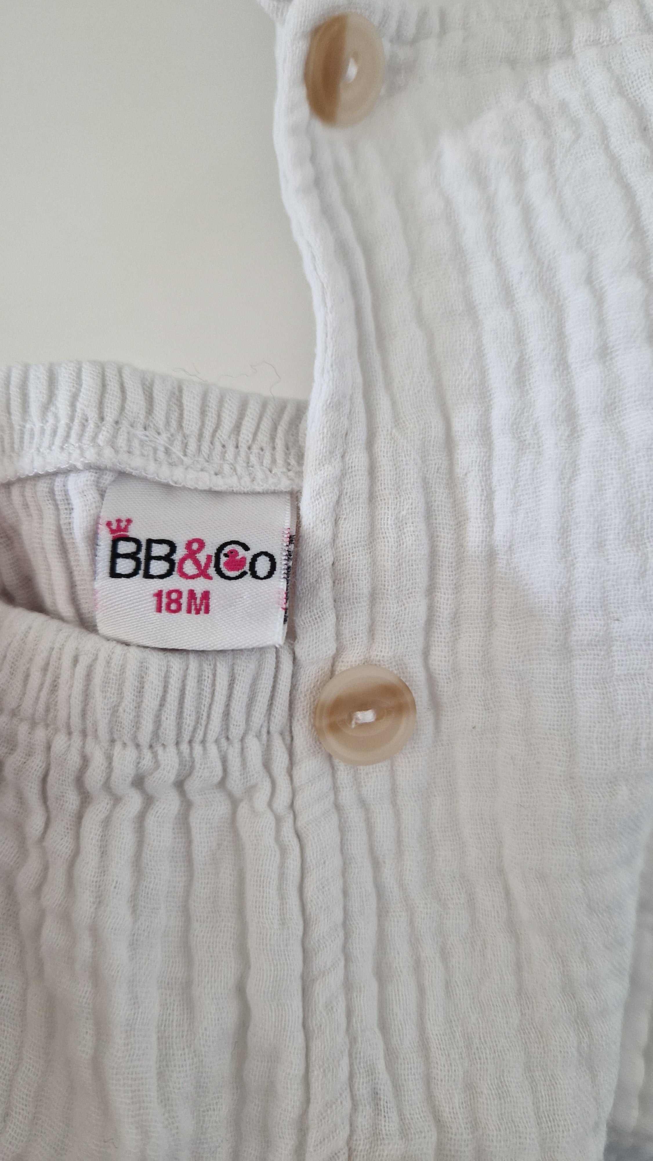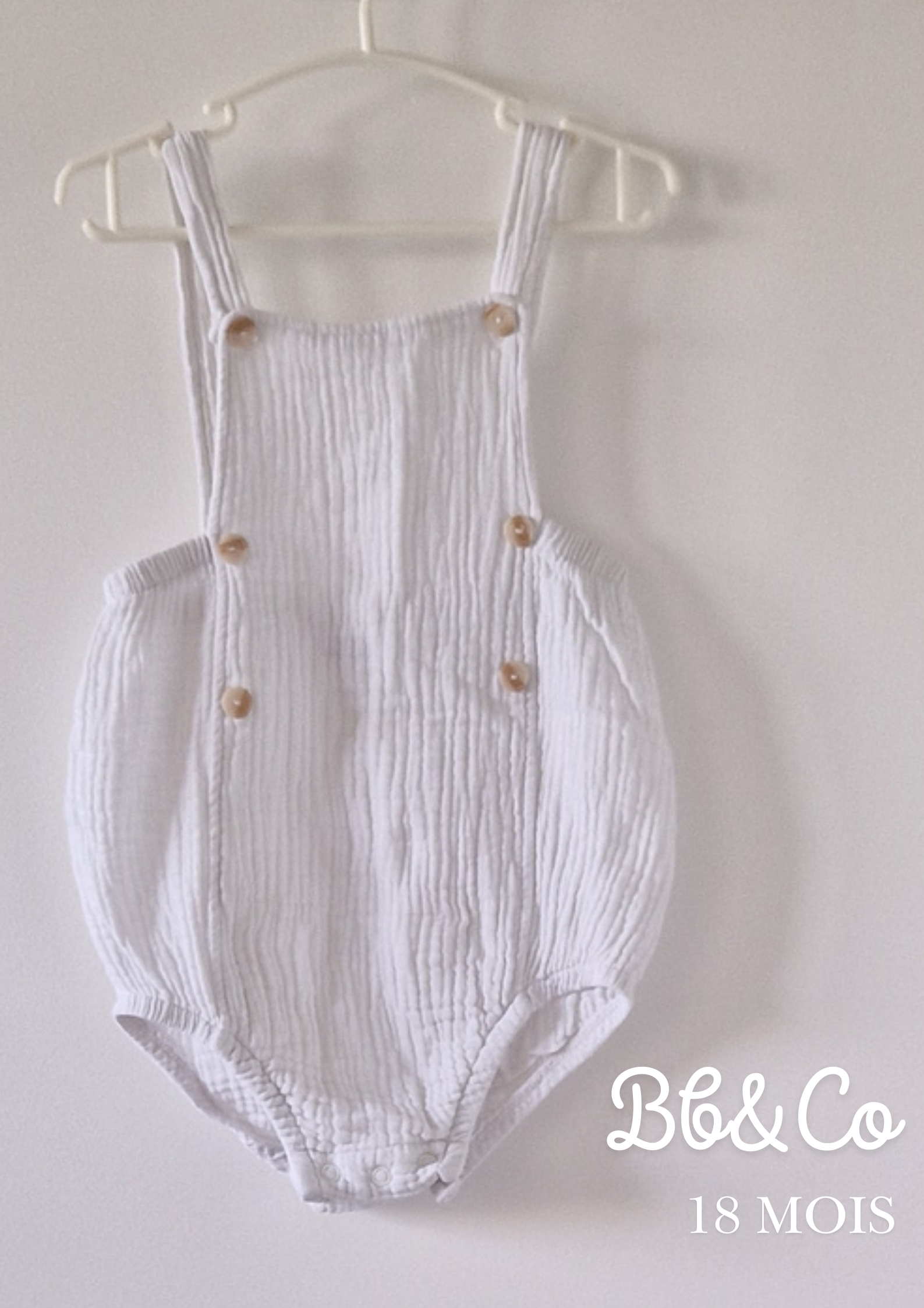 Barboteuse Bb&Co 📏 Taille étiquette : 18 mois. 🌈 Motif, couleur : Blanche mousseline. 🧬 Matière : Pas d'étiquette. 🔓 Ouverture :... En savoir plus
