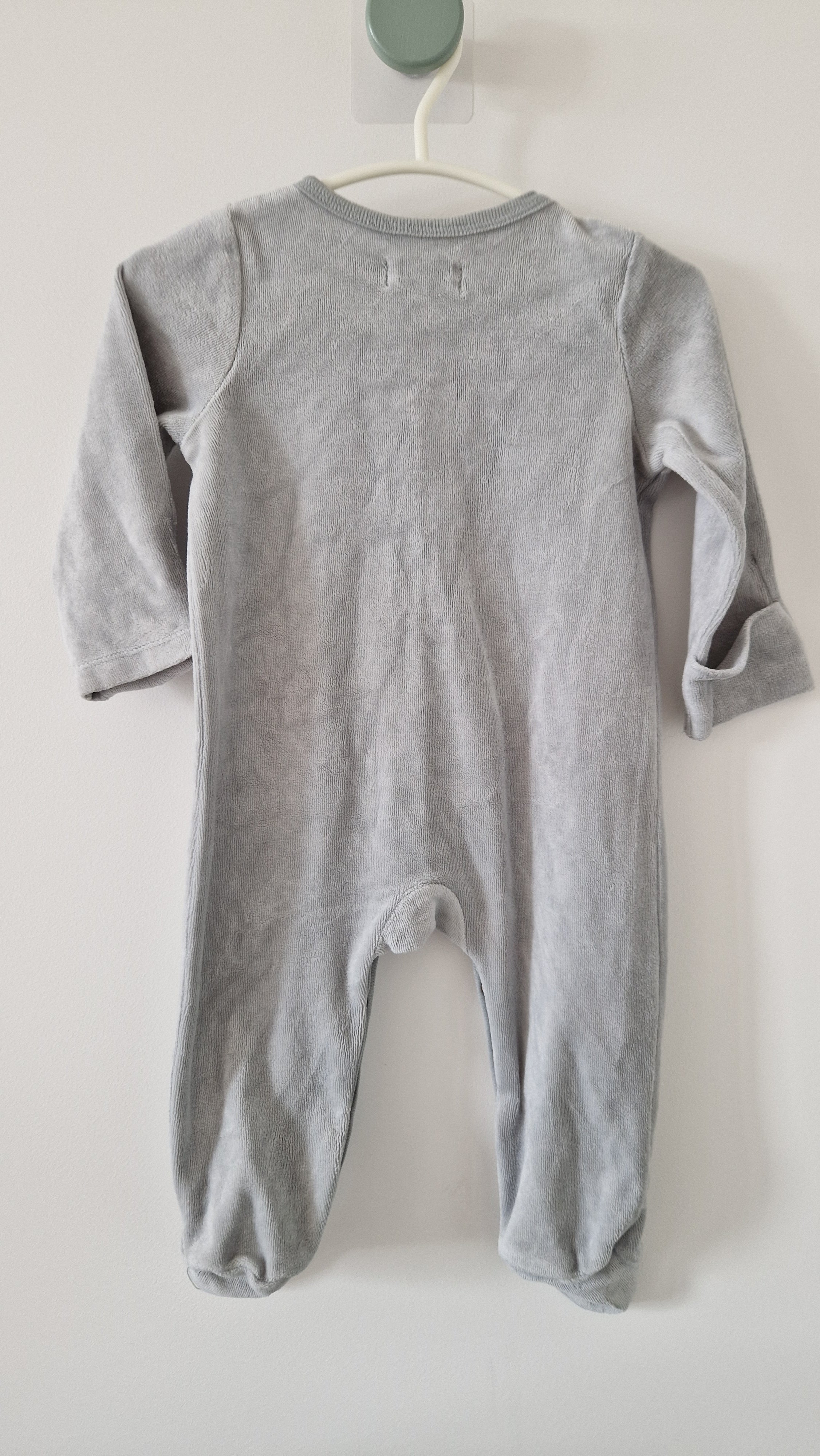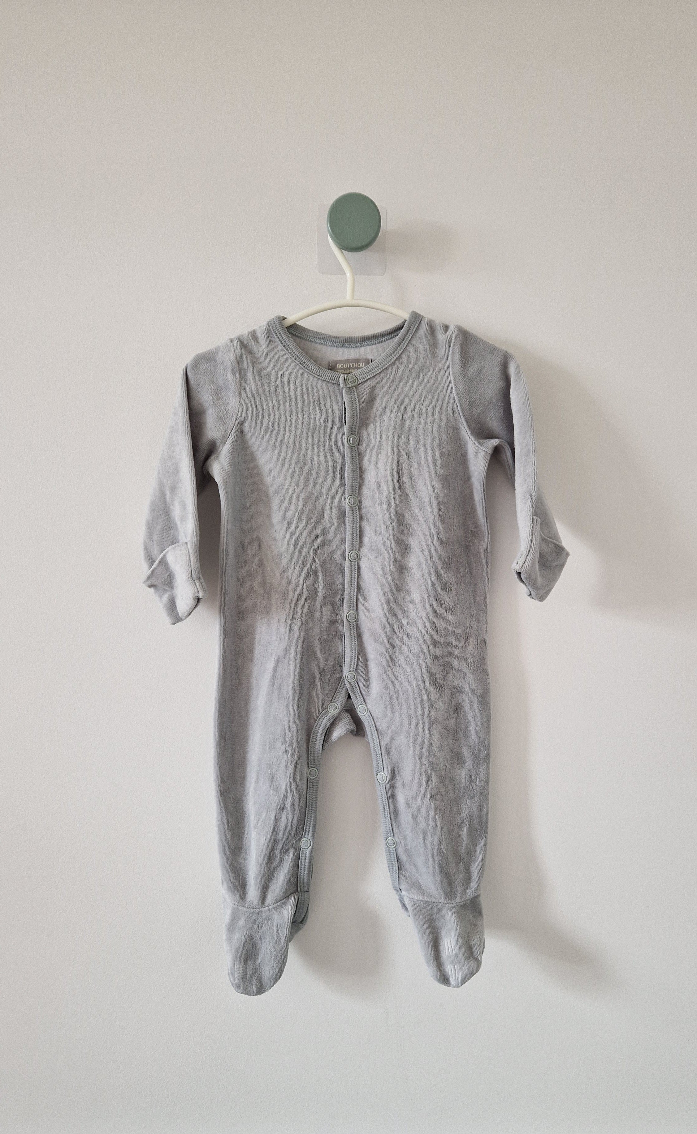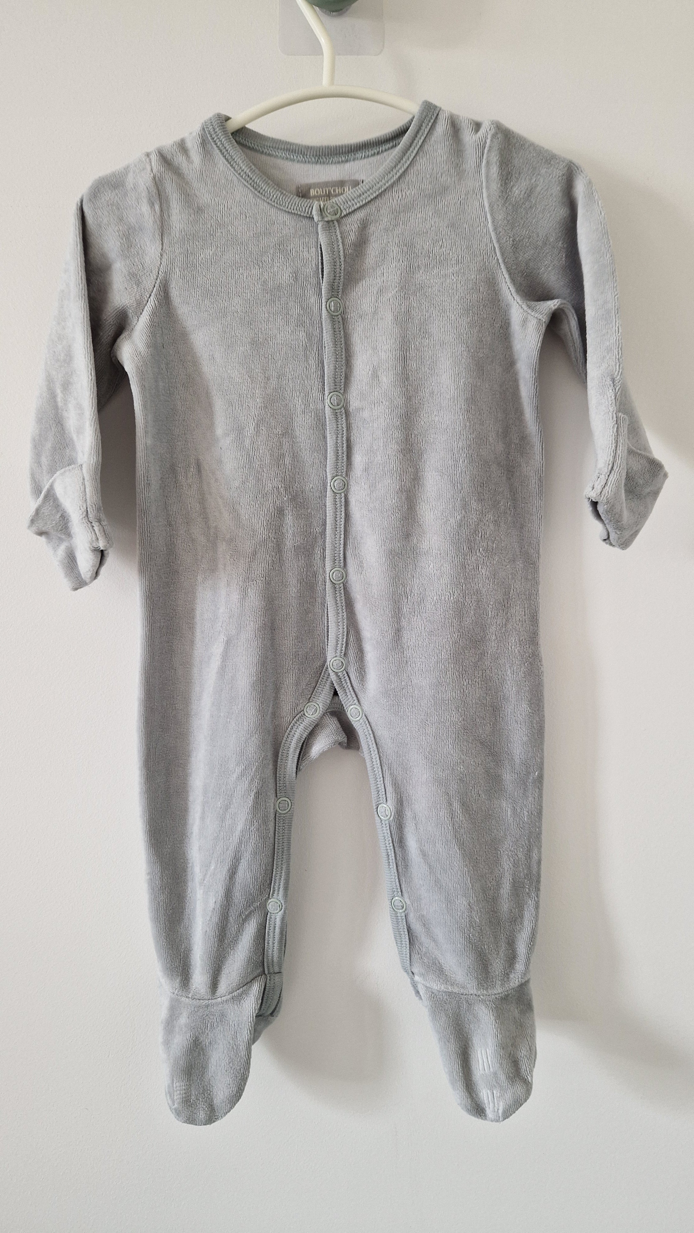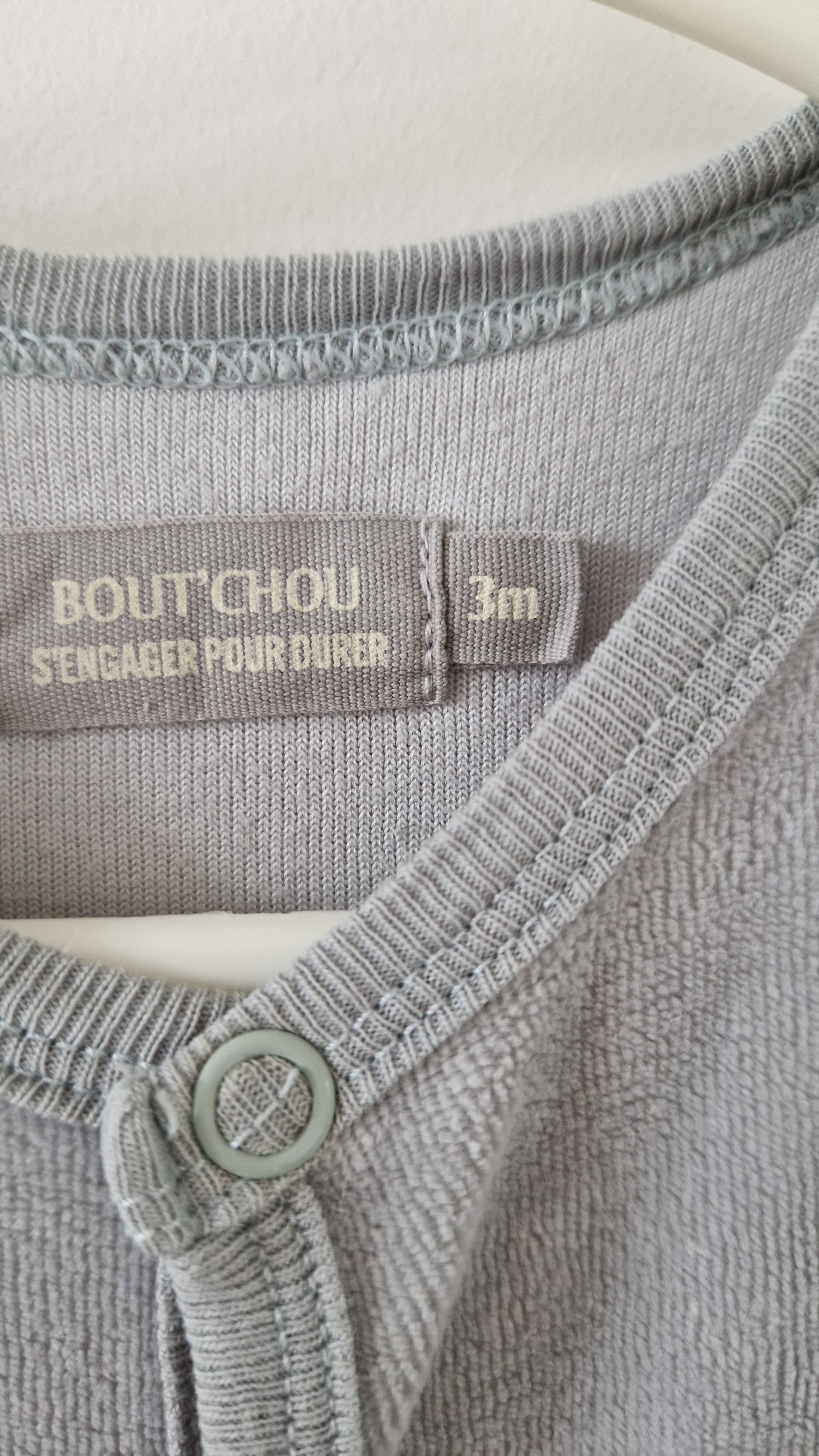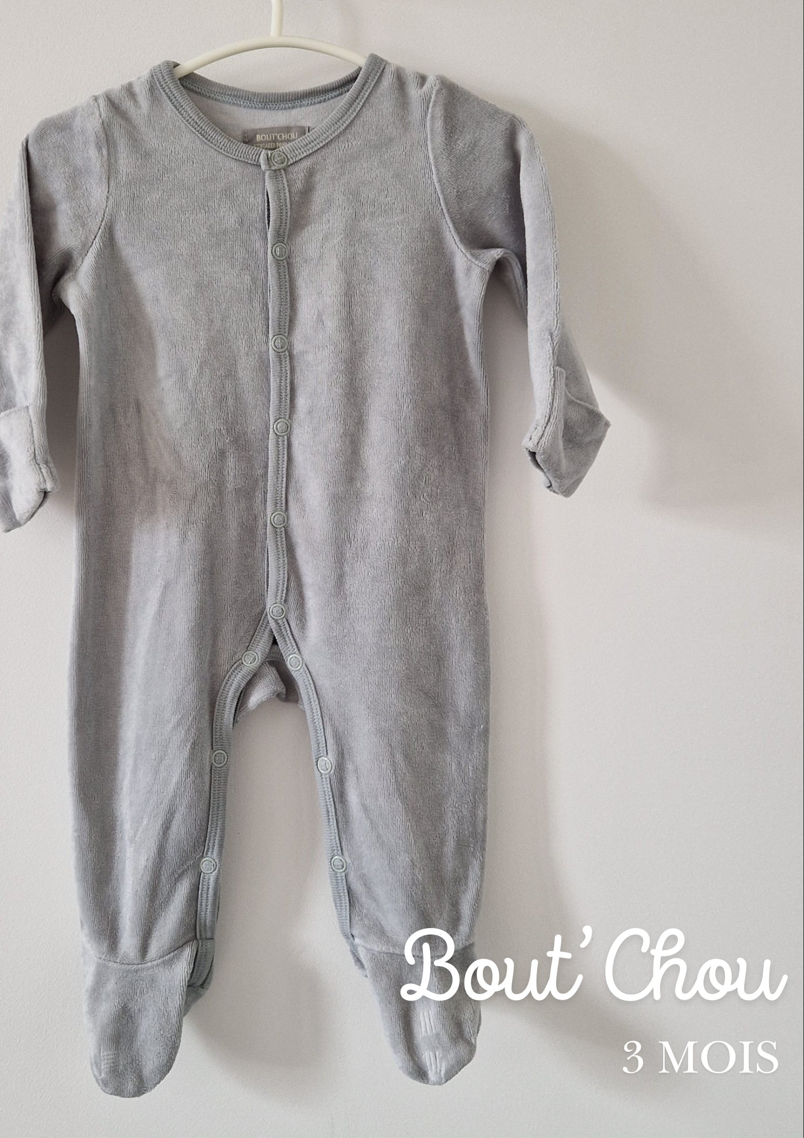 Pyjama Grenouillère Bout'Chou. 📏 Taille étiquette : 3 mois. 🌈 Motif, couleur : Gris. 🧬 Matière : Pas d'étiquette. 🔓 Ouverture : Par devant et entrejambe... En savoir plus