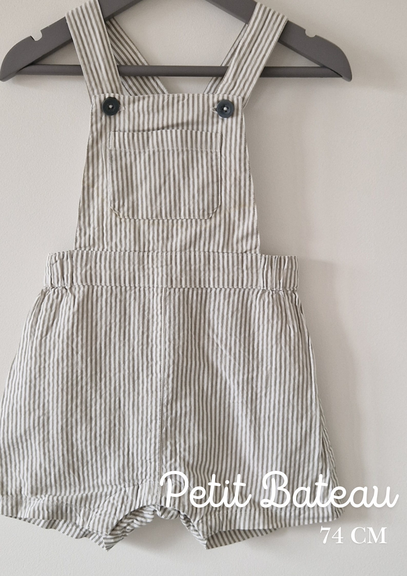 Salopette courte Petit Bateau. 📏 Taille étiquette : 12 mois - 74 cm. 🌈 Motif, couleur : Rayé taupe/blanc. 🧬 Matière : Pas d'étiquette. 🔓 Ouverture :... En savoir plus