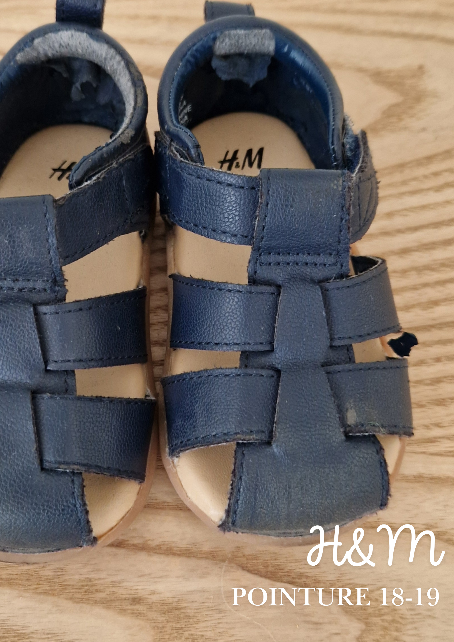 Chaussures Sandales H&M. 📏 Pointure : 18/19. 🌈 Motif, couleur : Sandales bleu marine. 🔓 Ouverture : Par scratch sur les côtés 🔎 État :... En savoir plus