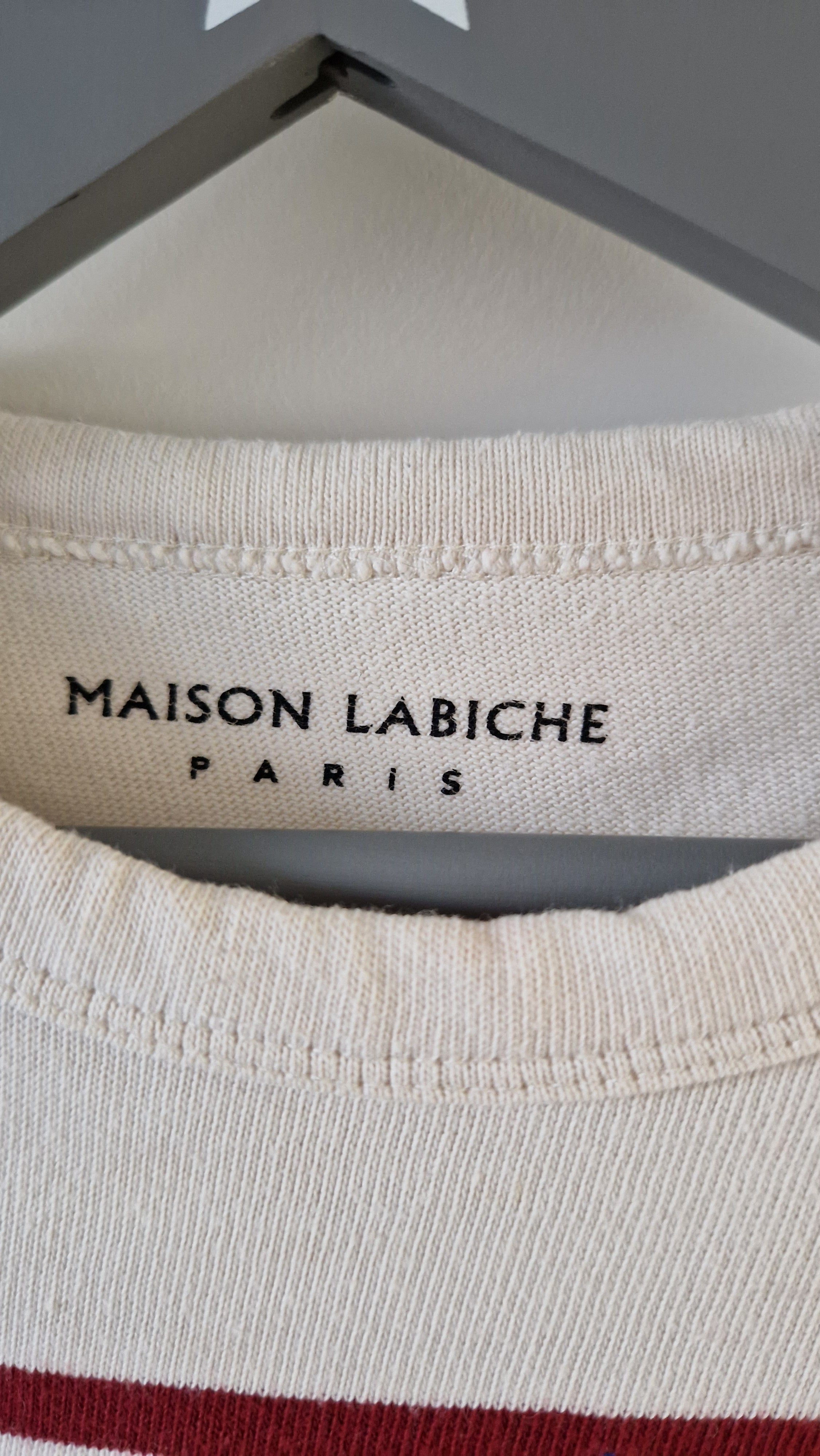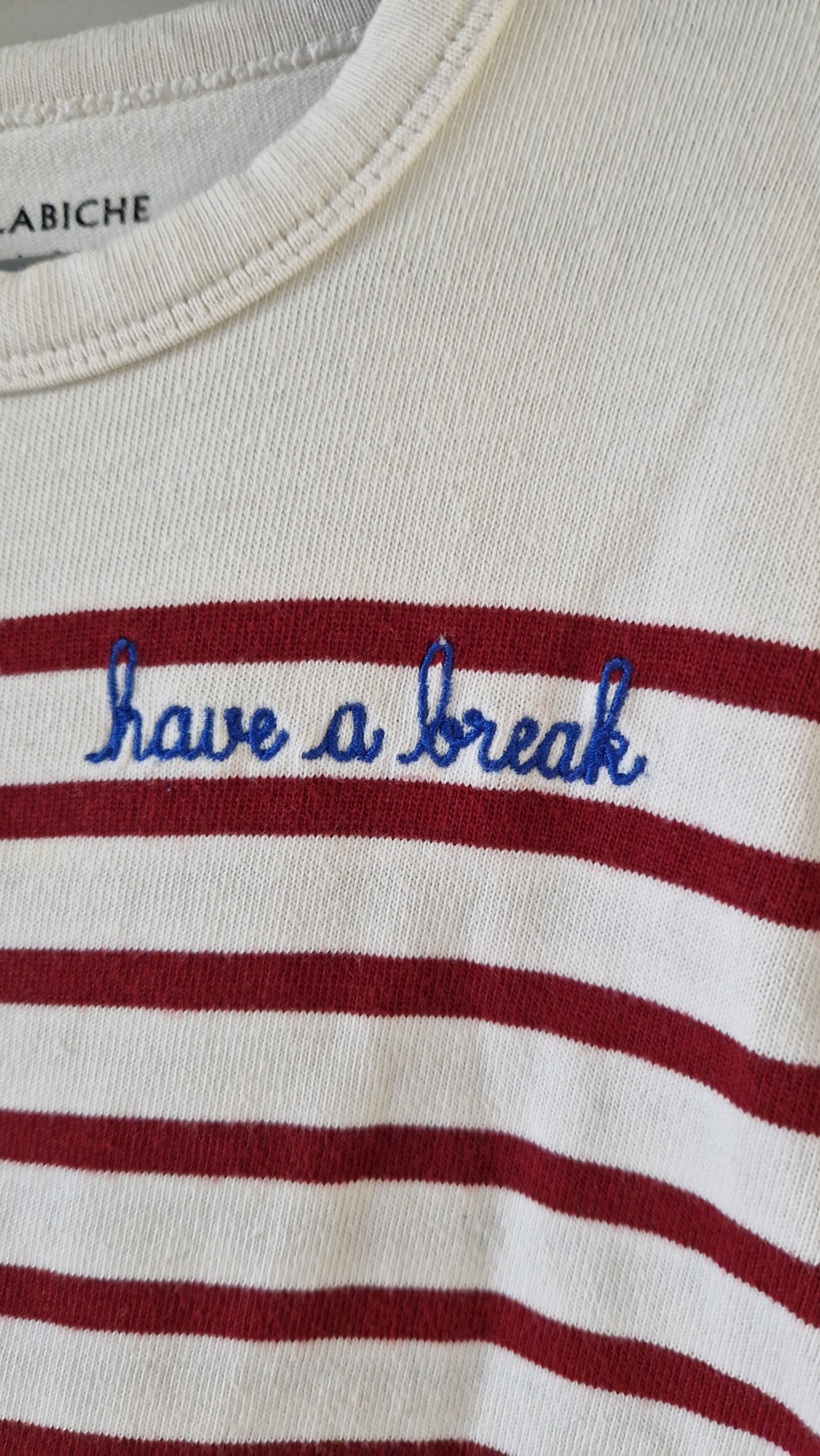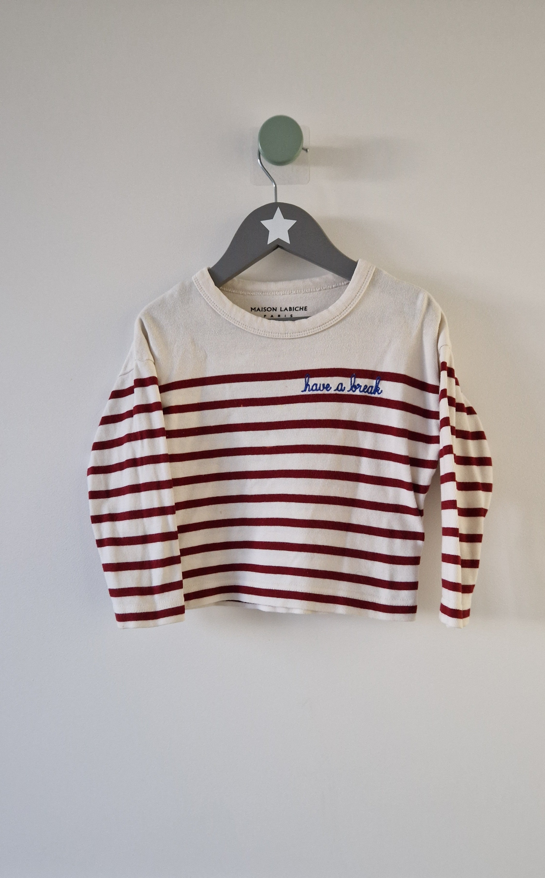 T-shirt manches longues, col rond Maison Labiche. 📏 Taille étiquette : 2 ans. 🌈 Motif, couleur : Écru, rayé rouge, brodé en bleu "Have... En savoir plus